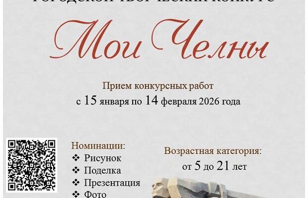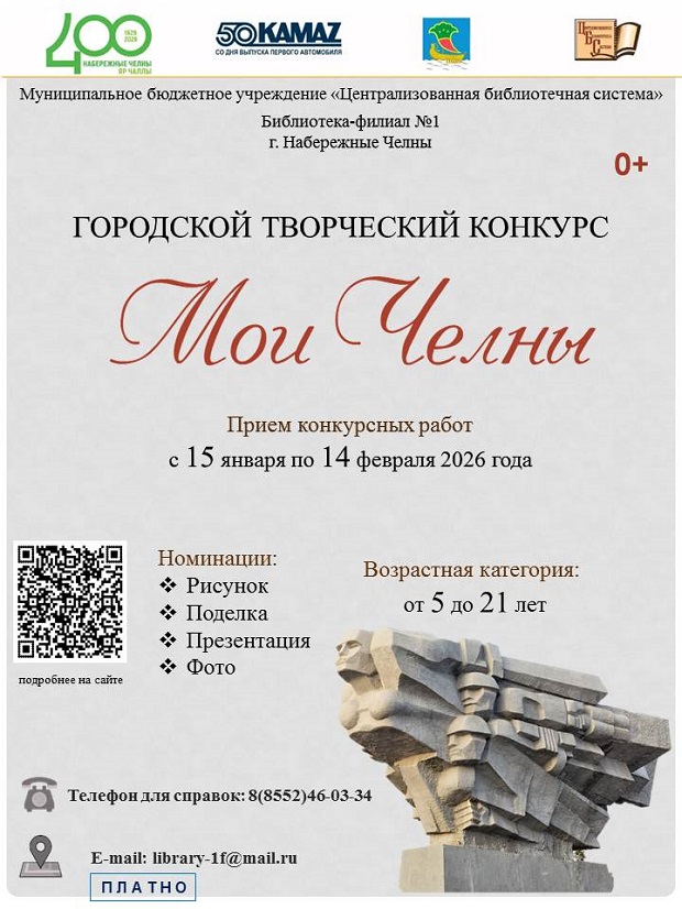 С 15 января по 14 февраля 2026 года МБУ «Централизованная библиотечная система» приглашает участников от 5 до 21 лет включительно принять участие в городском творческом конкурсе «Мои Челны», посвященный 400-летию города и 50-летию со дня первого выпуска автомобиля КамАЗ.