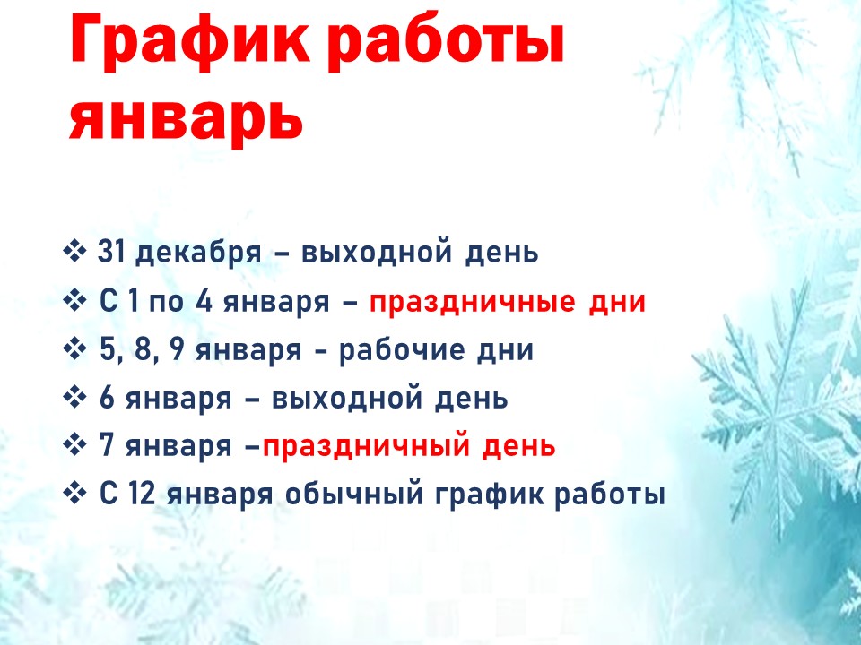 Мы хотим напомнить вам о графике работы нашей библиотеки в праздничные дни, чтобы вы могли насладиться чтением любимых книг и погрузиться в мир приключений и знаний.