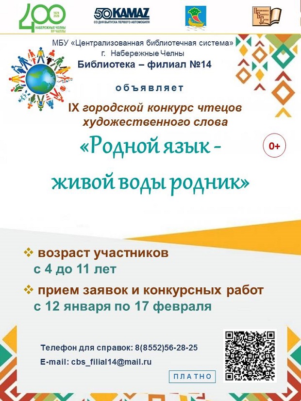 С 12 января по 17 февраля 2026 года МБУ «Централизованная библиотечная система» приглашает детей от 4 до 11 лет включительно принять участие в IХ городском конкурсе чтецов художественного слова «Родной язык – живой воды родник», посвященном Международному дню родного языка. Для участия в конкурсе необходимо подготовить выступление на русском или на татарском, или на других языках народов мира любой тематики и жанра (проза, поэзия).