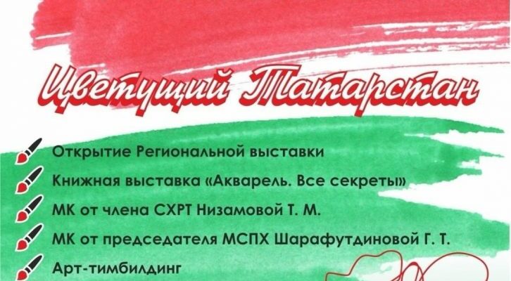 В Малой картинной галерее откроется групповая выставка «Цветущий Татарстан». В нем примут участие 47 художников из разных уголков нашей республики. Известные акварелисты Татьяна Низамова и Гузель Шарафутдинова проведут мастер-классы для профессионалов. Также будет организована книжная выставка «Акварель. Все секреты». Желающие смогут сделать акварельные наброски и принять участие в «АРТ-тимбилдинге», где нарисуют пейзажи родного края.