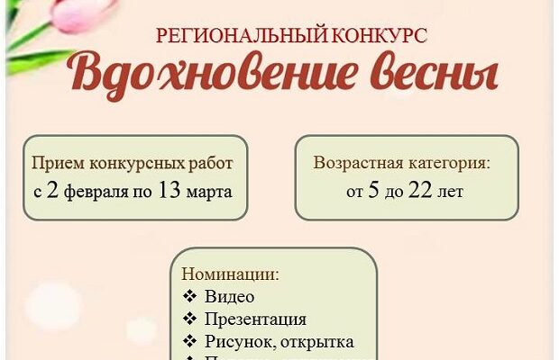 С 2 февраля по 13 марта 2026 года МБУ «Централизованная библиотечная система» проводит региональный конкурс «Вдохновение весны» для участников в возрасте от 5 до 22 лет включительно. Конкурсантам предлагается представить видеопоздравления, презентации, рисунки, открытки, поделки и аппликации, созданные в честь Международного женского дня.