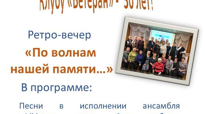 Клуб «Ветеран» будет рад встретить всех своих друзей 7 февраля в 14.00 часов в Центральной городской библиотеке на ретро-вечере, посвящённом своему 30-летию. В программе: песни в исполнении ансамбля «Айфаар», дуэта «Свет любви», Виктории Ляховецкой, выступление челнинских поэтов и многих других, кто любит и помнит историю клуба.