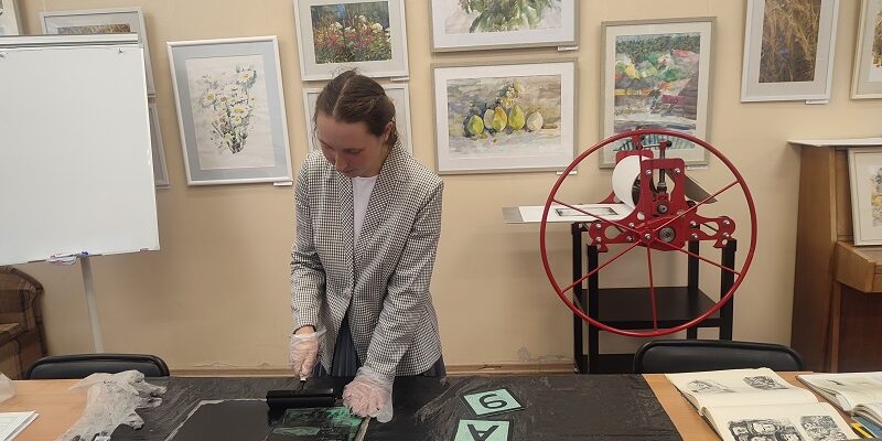 Участники изучили историю возникновения первых русских азбук и самостоятельно создали уникальные графические эскизы и макеты на тему «Алфавит» и «Әлифба». Профессиональная художница Полина Петрушкина (Недовизий) поделились секретами мастерства, продемонстрировав работу на офортном станке.