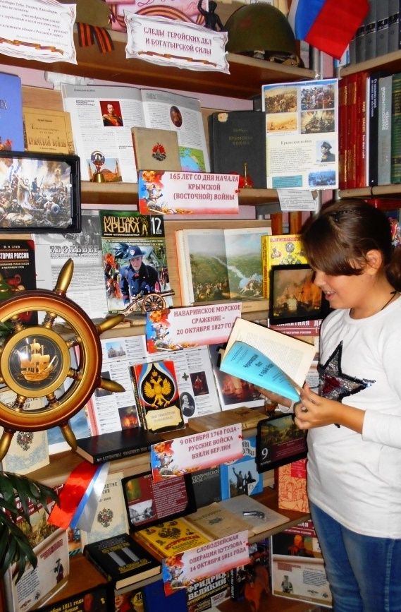 Эти строки современника тех событий Аполлона Майкова стали эпиграфом выставки гордой памяти «Следы геройских дел и богатырской силы» из цикла «Славные даты Великой России», оформленной в читальном зале библиотеки-филиала №4 им. М. М. Коцюбинского ЦБС для взрослых Симферополя.