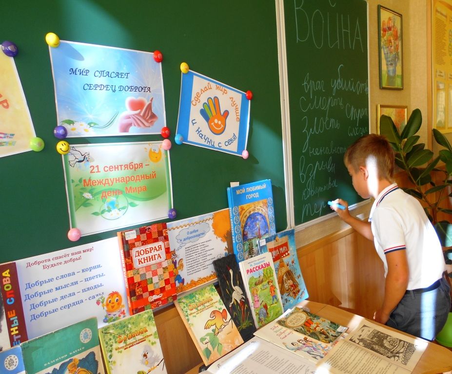 В преддверии «Дня без выстрела на Земле» и в рамках Года волонтера (добровольца) сотрудники симферопольской библиотеки-филиала №4 им. М. М. Коцюбинского организовали для гимназистов 3-А и 3-Б классов (преподаватели Светлана Прочитанская и Ольга Проничева) столичной гимназии №9 цикл уроков общения «Мир там, где верят и творят добро».