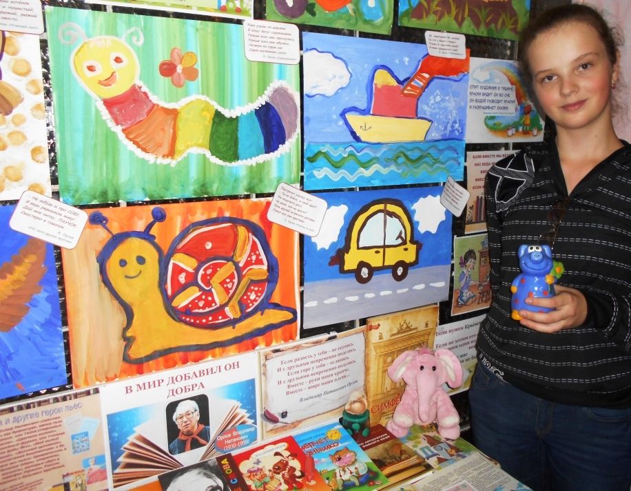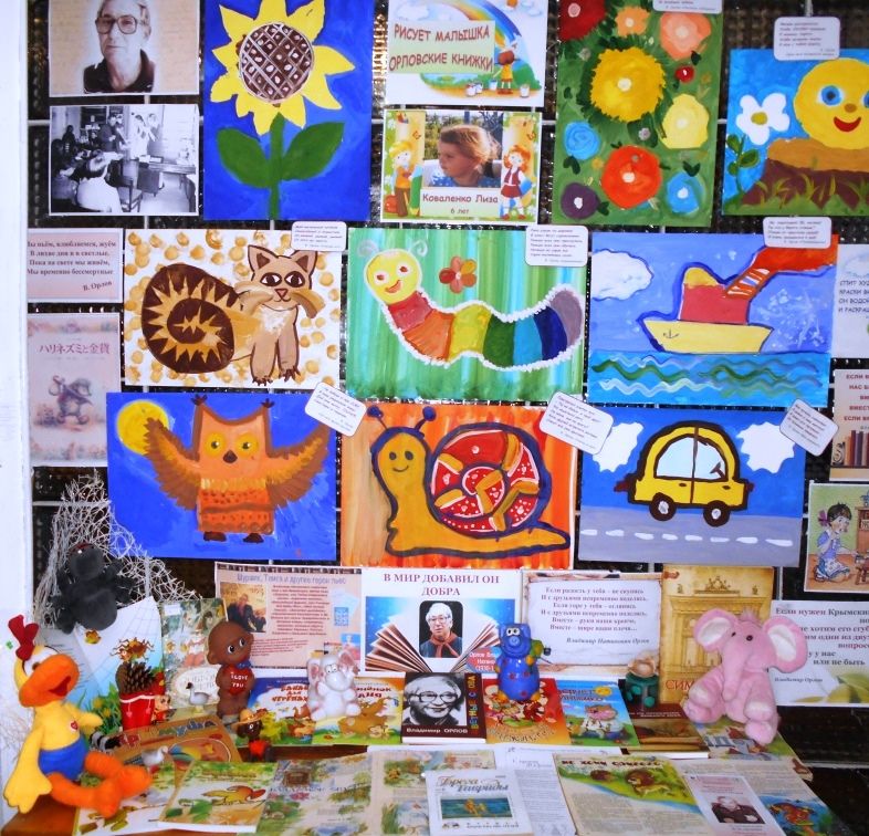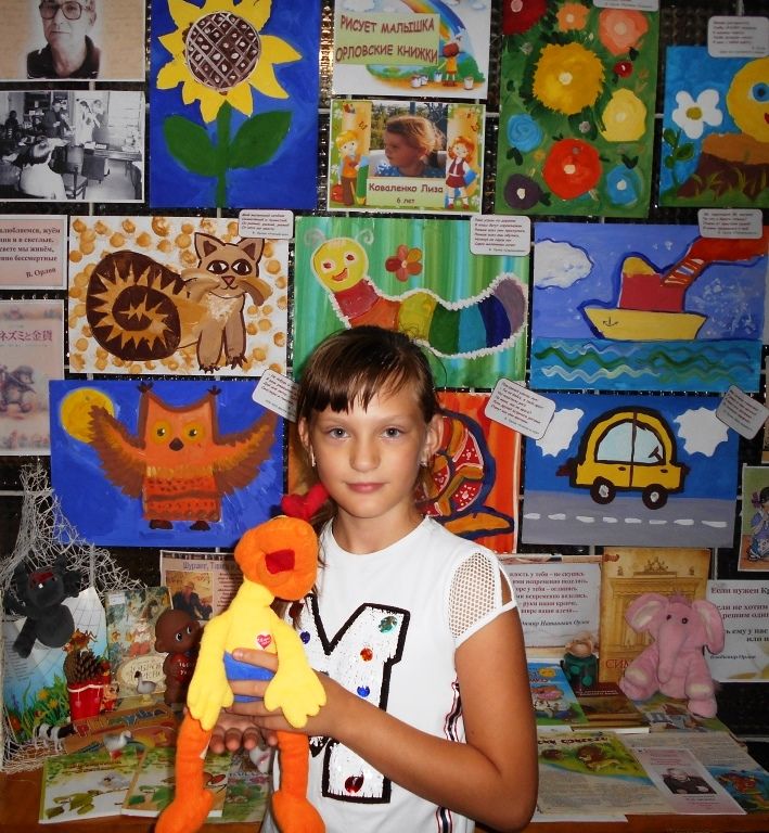 Первыми прочитанными Лизе мамой книжками были издания Владимира Орлова. Юная художница изобразила на своих рисунках любимых героев орловских книг: «Подсолнухи-цыплята рассыпались кругом…», «Мой маленький котёнок смышлёный и пушистый», «Повстречал улитку жук: – Ты не бойся, я твой друг!», «Рано утром по дорожке в класс бегут сороконожки», «Дай мне нитку, паучок, смастерю я гамачок» и др. Художница-волонтер расположила рядом со своими творческими работами свои любимые детские книги и мягкие игрушки, ассоциирующие героев Владимира Натановича: слоненка Баню, обезьяну Почешись, Петушка «без пуха и пера», Паучка «на воздушной тропинке — чужой паутинке», обиженную Хрюшку и др.
